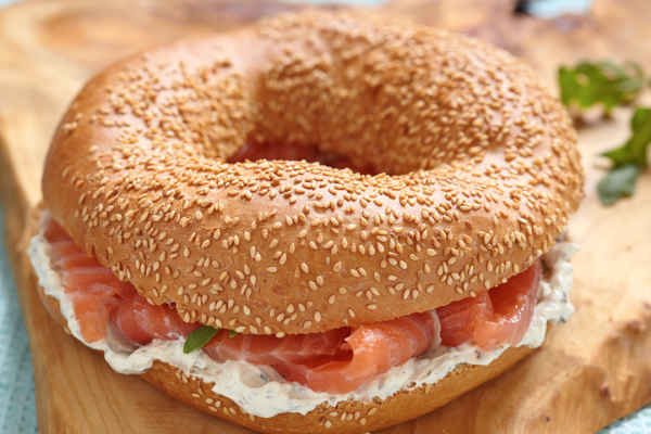 Lox and cream cheese bagels consist of individual serving sized, ring shaped breads cut in half and topped with slices of salt-cured salmon.